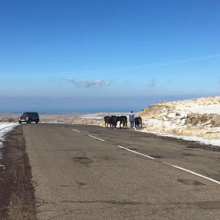 L’après-midi, pas le choix que de faire des kilomètres sur la grande route qui va en direction de Yerevan. Et qui grimpe, grimpe ! La circulation est dense, les voitures bien bruyantes et la conduite des arméniens parfois bien dangereuse: ils doublent à l’arrache et respectent peu les distances de sécurité avec nos vélos.