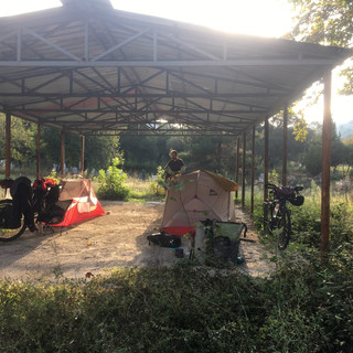Nous atteignons finalement pas le lieu de camping espéré, mais plantons nos tentes juste à côté d’un cimetière, sous une sorte de toit qui nous paraît le bienvenue au vue de la météo incertaine.